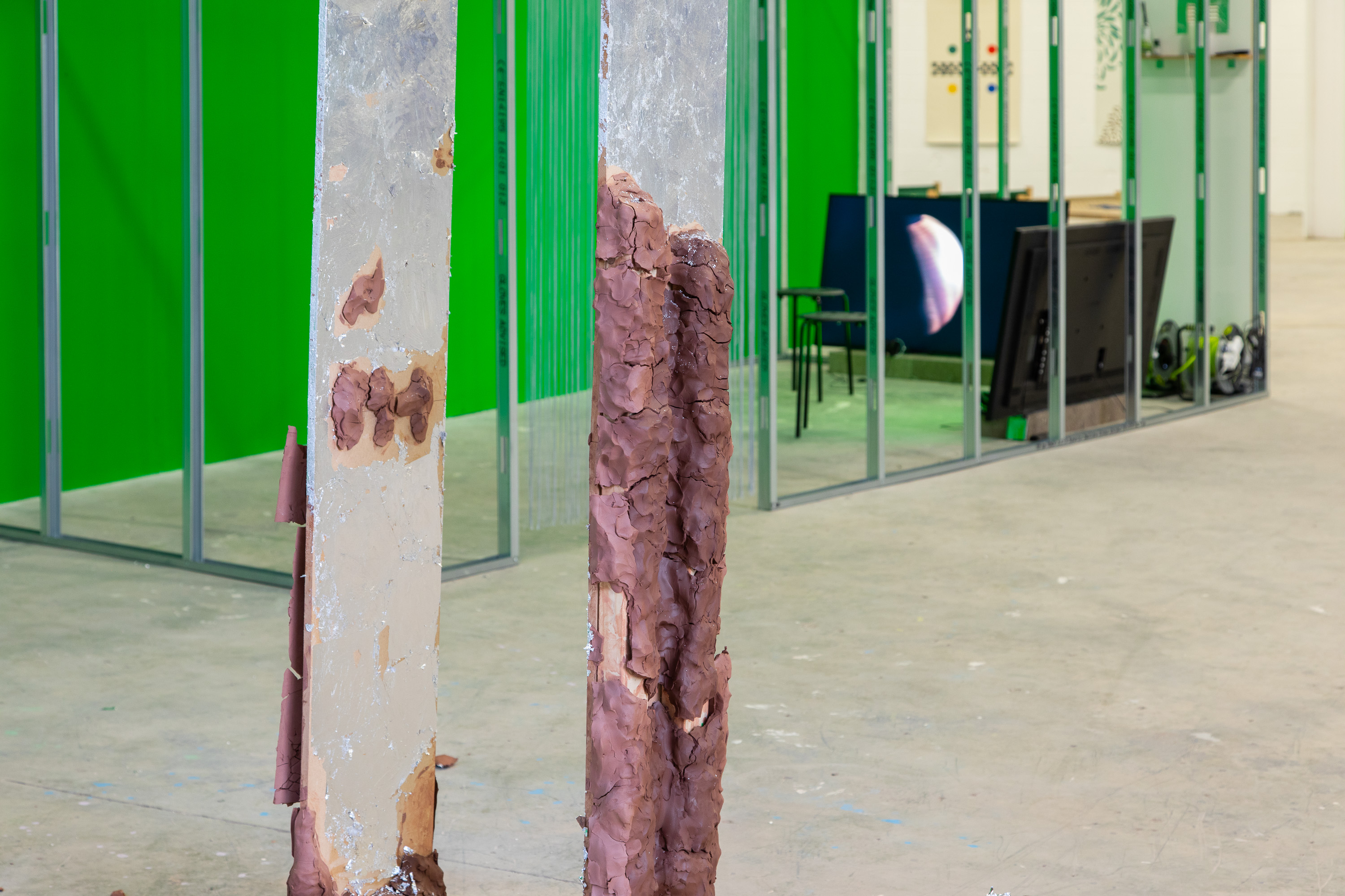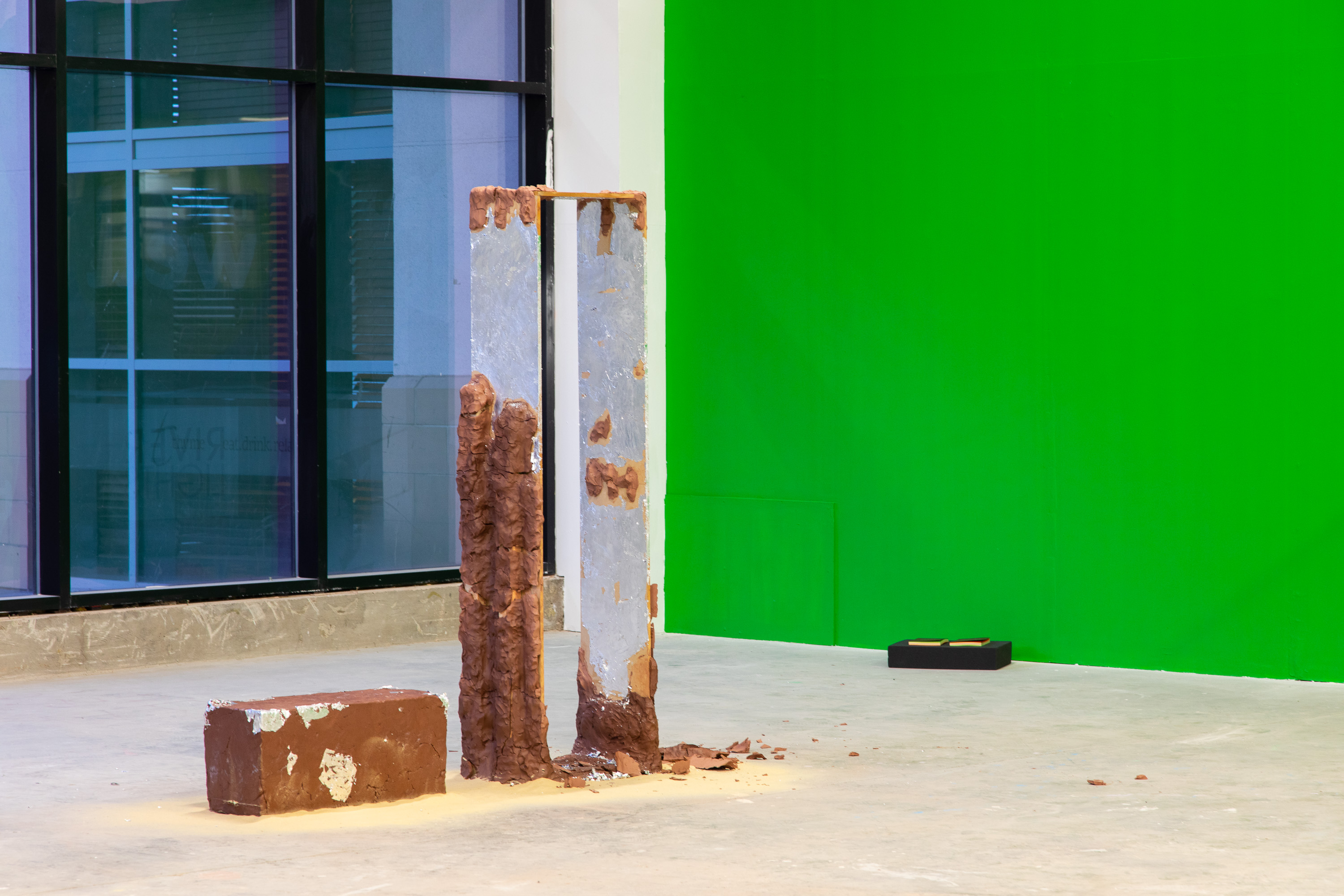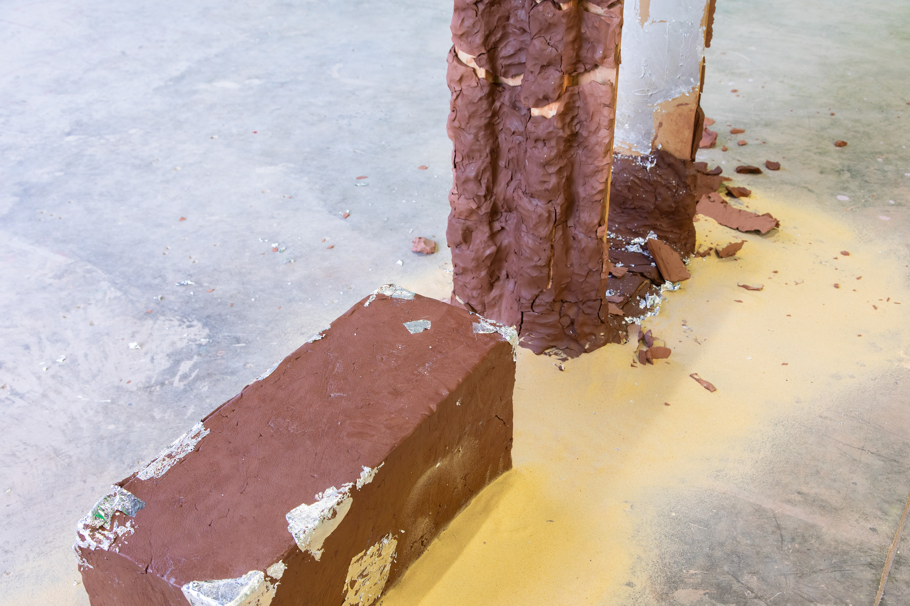 Terracotta Clay (Slowly cracking and falling as exposed to the conditions of the gallery), Silver Leaf, MDF, Brackets, Screws, Sand, Footprint using Adidas Trainers