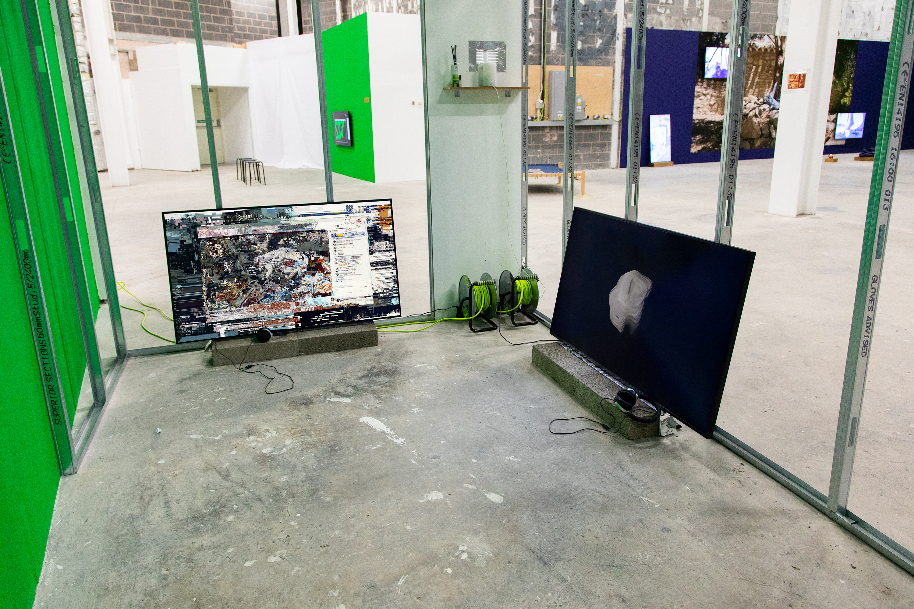 Metal Stud Wall System (based on the dimensions of our bedroom in India), Aluminium Curtain, MDF Wall, Breeze Blocks, Silver Insulation Tape, Silver Space Foil, Power Cables, HDMI Cables, Media Players, 5” TFT Rasberry Pi Screens playing White Screen, 55” OLED Screens playing moon/ISH.exe and Sonic Conversations, Headphones, IKEA stools, Metal Vent, Lemongrass Reed Diffuser, Lemongrass Essential Oil, Aroma Diffuser (Click here for mist)